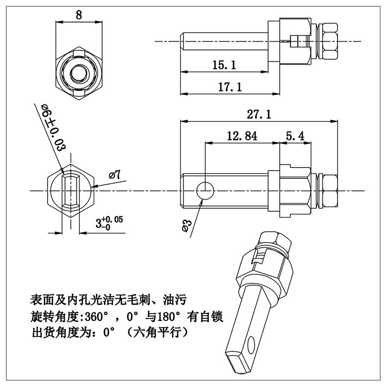 台灯金属支架转轴的轴套为六边形,轴件铣扁,装配时从台灯活动关节一侧压入即可使用,轴件固定,轴套转动。